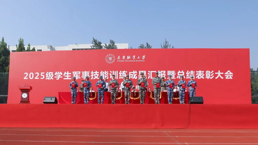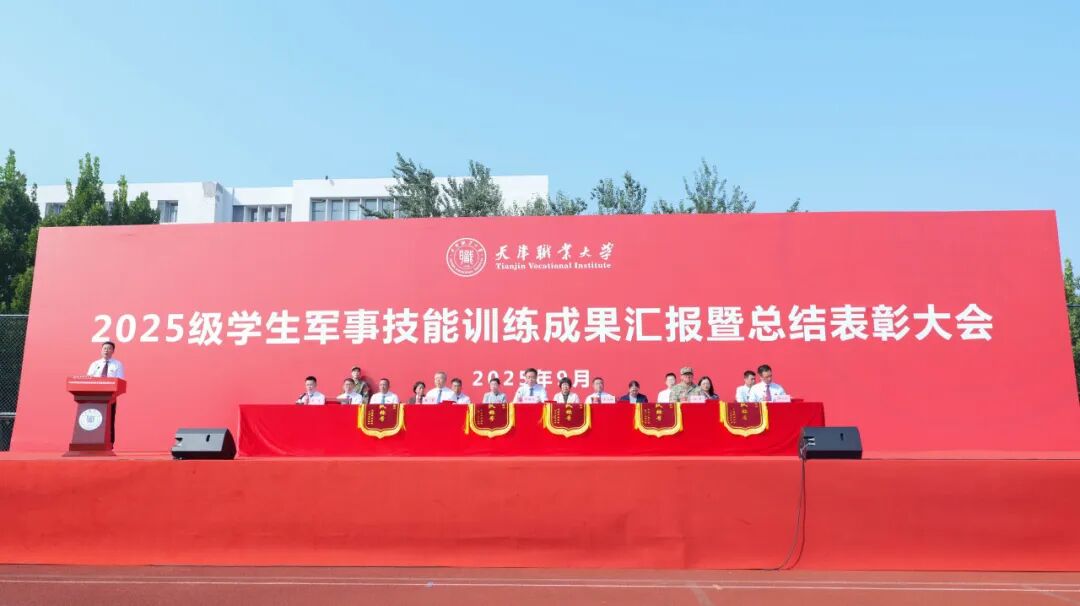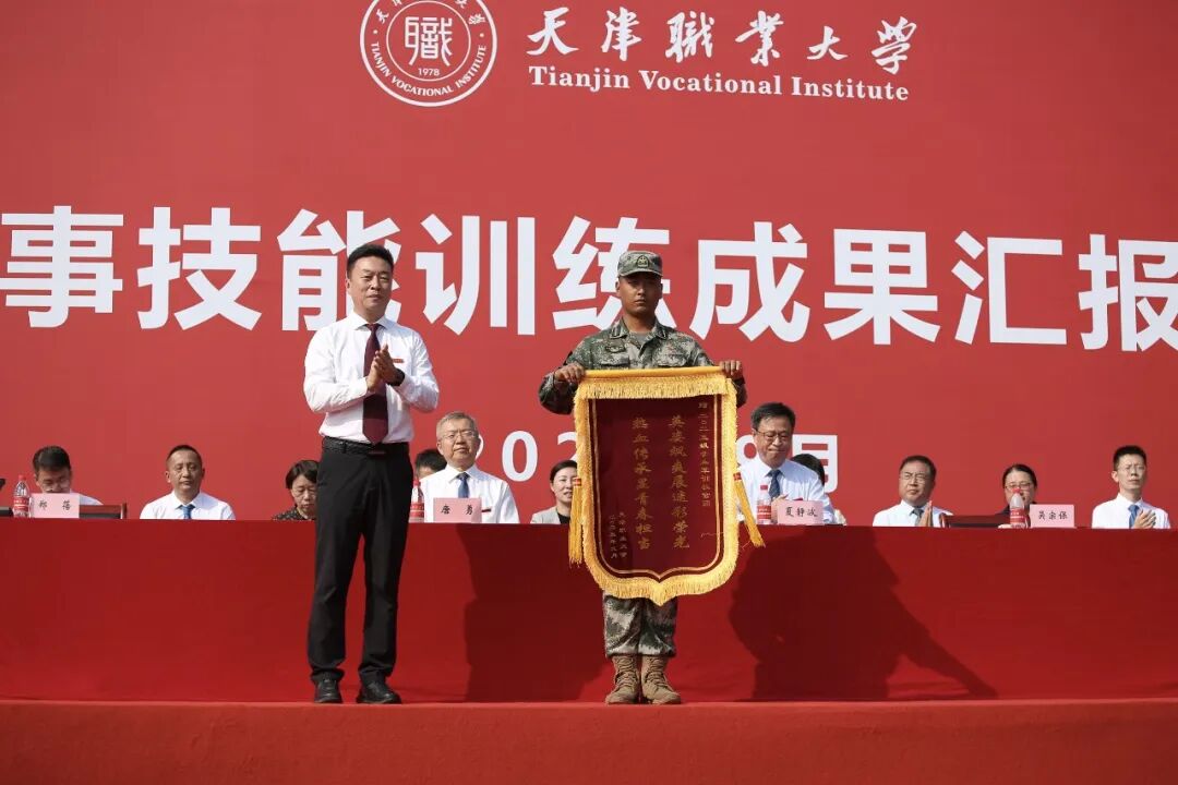 校党委副书记、校长吴宗保同志宣读《天津职业大学关于2025级学生军训的表彰决定》,向2025级学生军训教官团颁发锦旗,对承担本次军训任务付出辛勤汗水的教官们表示衷心感谢。与会领导为军训中获奖的优秀集体和个人颁发了锦旗和证书。