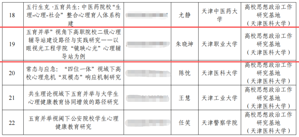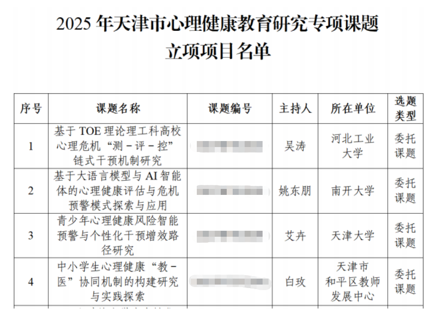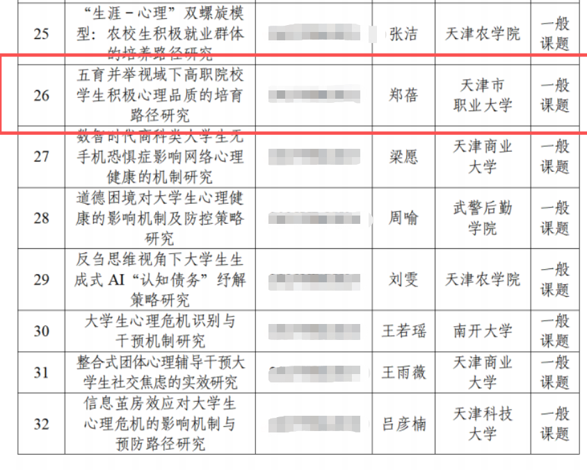 我校心理健康教育教师团队立足工作实践,积极开展课题研究,聚焦新时代大学生心理健康新特点、新规律,探索育人新路径。在2025年天津市高校思想政治工作研究基地课题申报工作中,我校教师申报的《“五育并举”视角下高职院校二级心理辅导站建设路径与实践研究——以眼视光工程学院“镜映心光”心理辅导站为例》课题,获批重点课题立项;在2025年天津市心理健康教育研究专项课题申报工作中,我校教师申报的《五育并举视域下高职院校学生积极心理品质的培育路径研究》课题获批立项,为我校心理健康教育工作提供了坚实的理论支撑。
