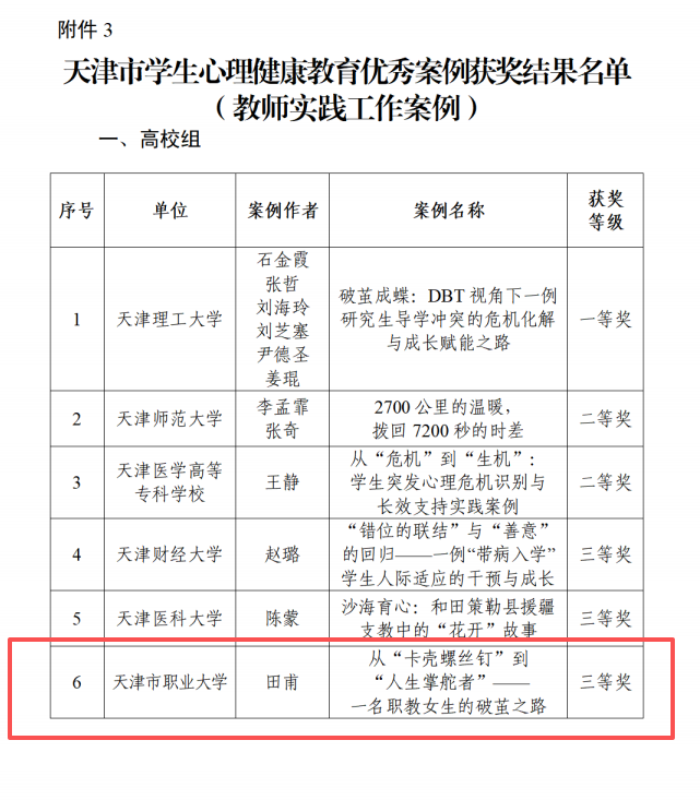 我校高度重视心理案例的积累与复盘,依托心理例会、心理督导等途径,探索学生心理困惑解决方案,凝练形成31个心理工作典型案例。同时,在2025年天津市学生心理健康教育优秀案例征集推广活动中,我校报送的《从“卡壳螺丝钉”到“人生掌舵者”——一名职教女生的破茧之路》案例脱颖而出,凭借鲜明的职教特色、科学的实施路径以及扎实的实践成效,荣获教师实践工作案例三等奖。